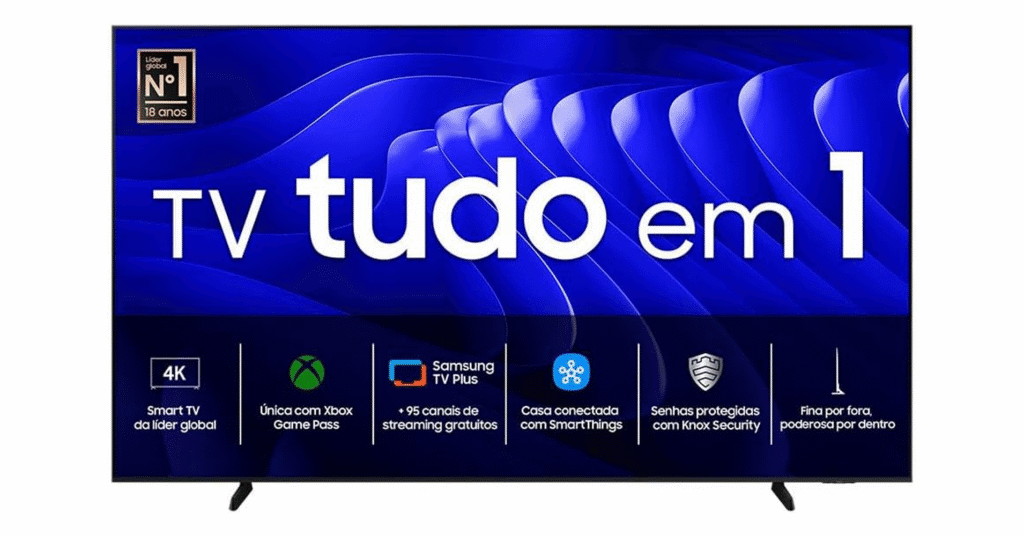 • Apps e Conteúdo: Acesso nativo a Netflix, Prime Video, Disney+ e Samsung TV Plus (canais grátis), além de navegador web e Samsung Health para treinos interativos.