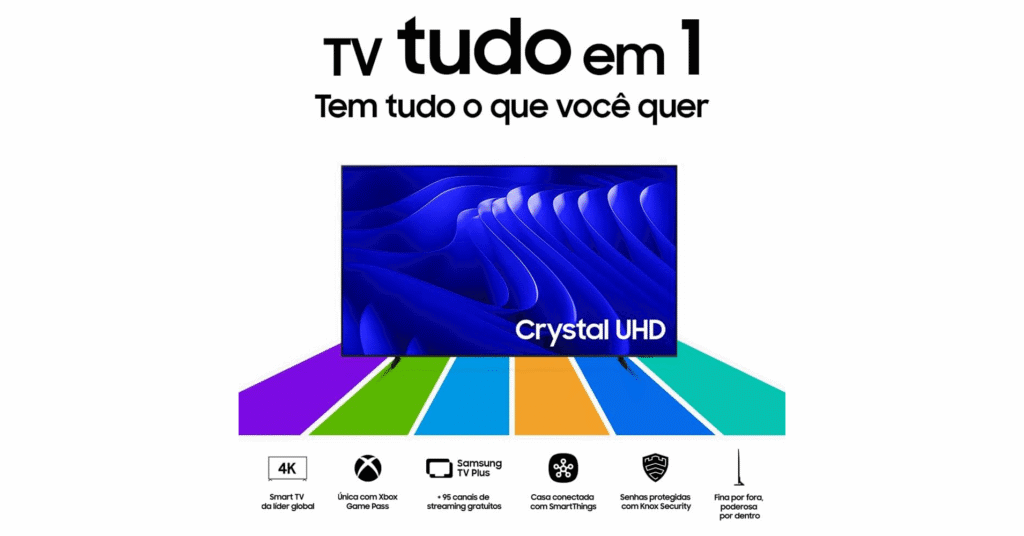 Com o Processador Crystal 4K e painel de até 120Hz, ela transforma qualquer ambiente em um cinema particular. Neste artigo completo, exploramos todos os detalhes, desde especificações técnicas até opiniões reais de usuários, otimizado para quem pesquisa TV 100 polegadas Samsung ou melhor TV grande para sala.